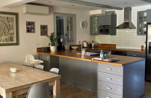 A spacious open and airy home walking distance to the charming historic village of Biot. The house has a private pool with easy to access steps and a safety cover making it perfect for young families. The house is 170m2 with a garden of 1600m2. There are 3 bedrooms upstairs. 2 double and one with bunk beds and a large cot. There is an en suite bathroom as well as a family bathroom and a separate toilet. Downstairs there are 2 further double rooms and separate toilet. There is airconditioning in the main living areas downstairs.