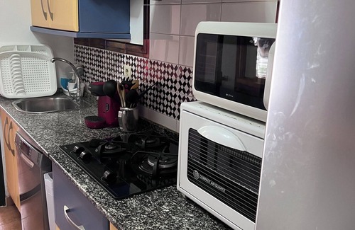 You will have a fully equipped kitchen, with fridge, microwave, and utensils.