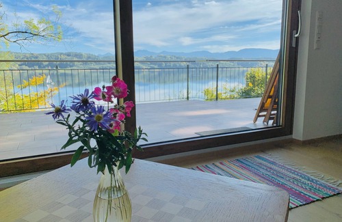 The view from the house of the lake and the mountains behind it will compensate for the missing TV.