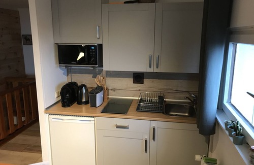 Our modern kitchen of course includes a refrigerator, two hobs, a kettle, a coffee maker, a toaster, pans, pots and of course crockery with cutlery. Here you can let your culinary arts run wild and cook your loved one or get cooks.