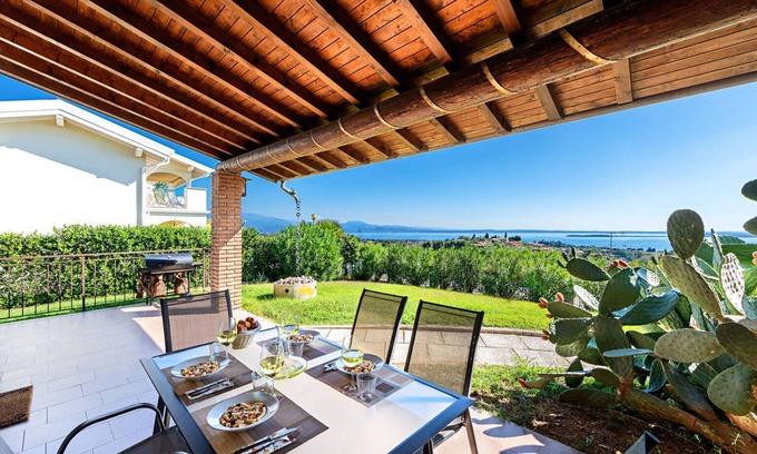 Located among the green hills of Lake Garda, Villa Alma offers the possibility of staying up to 6 guests in the renowned area of Valtenesi on Lake Garda. The strategic position of the Villa guarantees total privacy for guests enjoying the proximity of Lake Garda and the great tranquility of the Morainic hills. Ideal as a starting point for visiting the historical and natural beauties and food and wine tours of the area. The villa is entirely developed on the ground floor and consists of a large single room that houses the kitchen, the dining room and the living room with the sofa bed. From the living room you pass through a small hallway to the two double bedrooms and the bathroom with shower. In front of the living room there is a large covered terrace with a splendid lake view and a barbecue. In the verdant garden there is an above-ground swimming pool facing the back towards the small lake nestled in the green hills. The second bathroom, accessible from the outside, with shower in the basement is available for the swimming pool. Inside the property there are two parking spaces.