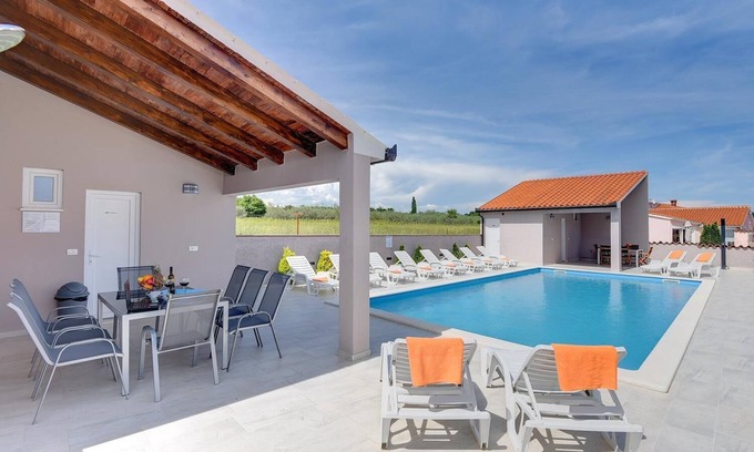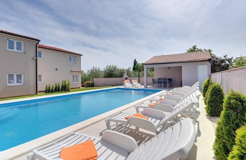 We present you the modern villa, located in the picturesque suburb of Pula, which can accommodate up to 16 people. The villa consists of two houses, each with three bedrooms, a living room with dining area and a fully equipped kitchen. Two bedrooms and a bathroom are on the ground floor, while another bathroom and a bedroom are on the ground floor. The outdoor area has a private pool with manicured lawn and a children's playground. Each house also has its own covered terrace, so you can enjoy the outdoors without any worries. This villa is the ideal choice for several families or a group of friends - so book your stay today!