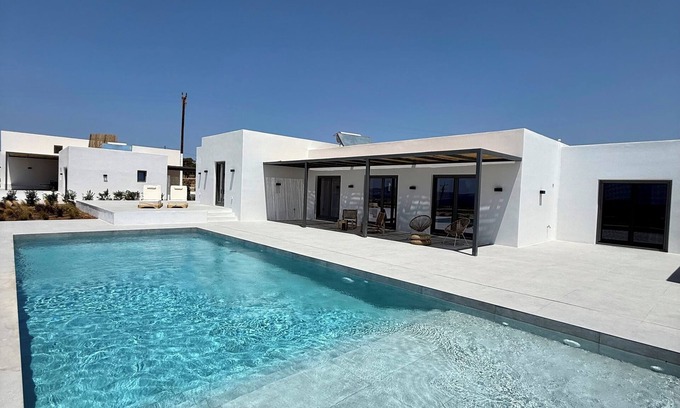 This brand new villa is part of an exclusive three-villa complex, yet offers complete privacy for those seeking a tranquil retreat.Situated on a hillside, it offers wide views of the azure sea, allowing guests to enjoy breathtaking sunsets.The villa's design is a harmonious blend of modern luxury and timeless elegance, with stylish interiors.Spacious living areas, floor-to-ceiling windows, and a private pool surrounding by natural beauty,making it the perfect getaway for those who value privacy.This villa on Paros Island is a stylish and relaxing retreat. It features three comfortable bedrooms, each with its own bathroom and a private pool with stunning sea views. Located close to the famous Faragas Beach and 1.0 km from Piso Aliki beach. It is 2 minutes driving from the picturesque village of Aliki where there are many restaurants,cafeterias,super markets,pharmacy and bars.The villa offers a modern design with an open living space, a fully equipped kitchen, and plenty of outdoor areas to enjoy the beautiful Mediterranean surroundings. Accessed by car, it includes private parking for each villa. All areas of the villa are easily accessible, ensuring a convenient and relaxing stay.