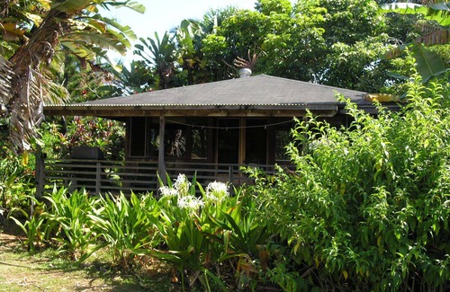 The farm stay cottage is an attractive, hand-crafted 500 square foot wooden guest house – completely self-contained and away from the main house. It overlooks our vegetable garden. It is landscaped with lush, tropical plantings to insure your privacy. Decorated in simple and tasteful island style, the cottage is fully and comfortably equipped for any length stay-with full bathroom with shower and tub inside, outside shower for after beach (or anytime– we so prefer guests us this exclusively), dining area, kitchenette and large covered lanai with grill.