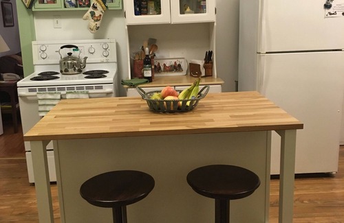 The 4 bedroom farmhouse has 3 bedrooms + 2 full bathrooms on the second floor, and an office/ futon bedroom on the first floor adjacent to the kitchen.