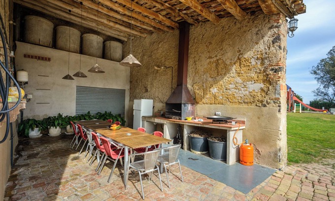 Overlooking the mountain, the farmhouse Can Guinau with step-free access and interior in Aiguaviva impresses guests with its fantastic views. The 350 m² property consists of a living room, a fully-equipped kitchen, 5 bedrooms and 3 bathrooms and can therefore accommodate 15 people. Additional amenities include high-speed Wi-Fi (suitable for video calls) with a dedicated workspace for home office, a TV, a fan, a washing machine as well as children's books and toys. On top of that, a table tennis table is also provided for your enjoyment. 2 baby cots and a high chair are also available. This accommodation does not offer: air conditioning. This vacation rental features a fenced pool, garden, open terrace, covered terrace, barbecue, playground, and outdoor shower for your enjoyment.