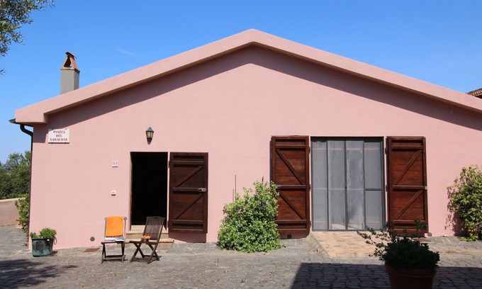 Stay in the countryside amidst olive trees, fields, and near the sea. This farmhouse in Montalto di Castro has 3 bedrooms where 5 people can stay. It is perfect for a group or families with children to relax with a shared swimming pool and air conditioning.