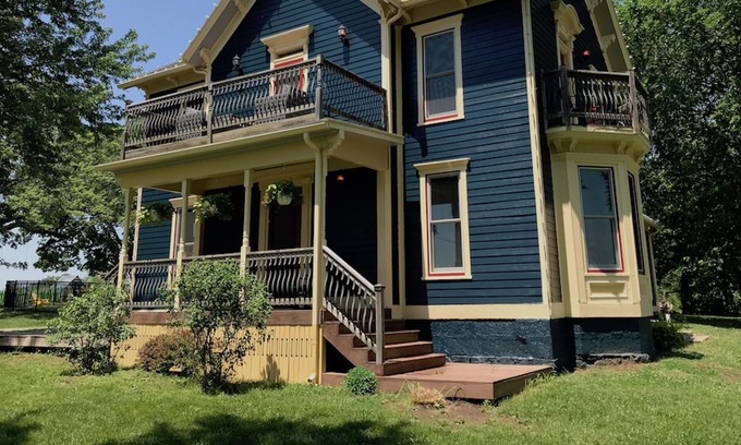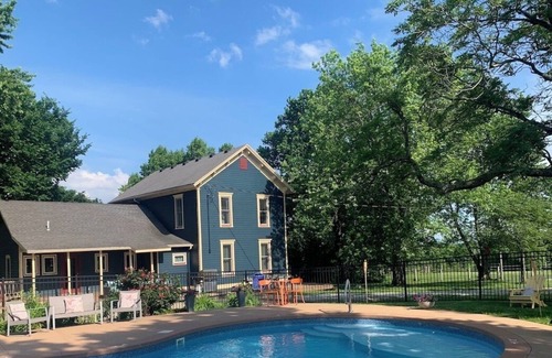 Farmstay vacation rental in 1880's Victorian farm house. 5 unique guest rooms, open and sunny common rooms, and fully equipped kitchen. Surround by beautiful outdoor spaces, fenced in-ground saltwater pool, hot tub, decks, patios, and balconies. Working 15-acre farm with animals, walking trails, fishing pond, working barn with family lounge area, in the Kansas countryside with no visible neighbors but located at the highway for easy access.
