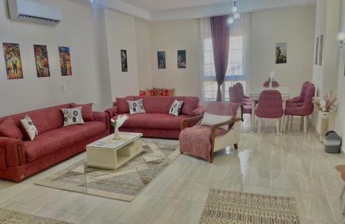 Fashionable Four bedrooms apartment in New Alamein is located in El Alamein, just 13 miles from Marassi Marina and 9.2 miles from Porto Marina. Guests may go for a swim in the plunge pool. There's free private parking, and the property offers a paid airport shuttle service. The air-conditioned apartment consists of 4 bedrooms, a living room, a fully equipped kitchen with an oven and a kettle, and 5 bathrooms with a bath and free toiletries. A flat-screen TV with streaming services is featured. The apartment offers bed linen, towels, and daily room service. The apartment has a picnic area where you can spend the day outdoors. El Alamein International Airport is 30 miles away.
