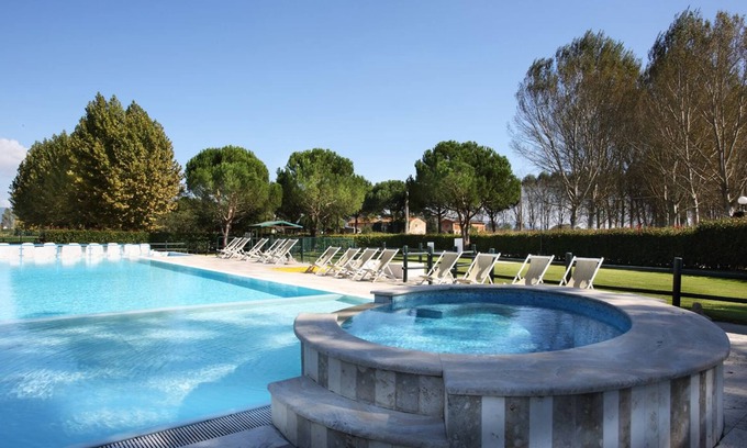An outdoor pool, a children's pool, and a hot tub are on site.