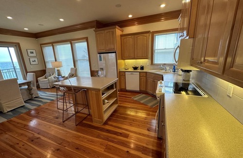 Warm wood cabinets and a large spacious island welcome you into a large kitchen big enough to host the entire family and prepare gourmet meals equipped with a panini maker, blender, cooking and serving dishes. Adjacent lies the dining area with a large table, surrounded by expansive windows and sliding glass doors that open to a lovely gulf front deck perfect for your morning coffee.