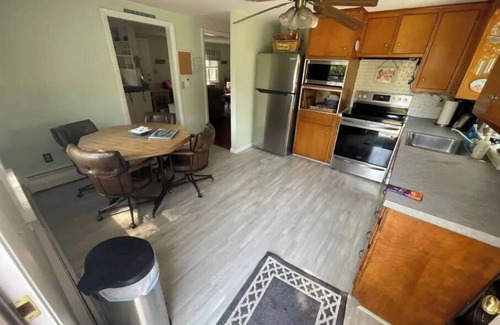 This is a single story ranch home that's been in our family for decades. This year (2022) we completed numerous guest-minded renovations. Sleep soundly on the new king sleigh bed with plush coil spring mattress or the new queen cherry-wood bed with a memory foam mattress. An additional queen daybed off of the living room nook allows up to 5 guests. Cool off with our whole-house Mitsubishi mini split air conditioning system. Cook your meal in the new range, store your ingredients and beverages in the new refrigerator, clean your clothes in the new washer and drier with the laundry supplies that we supply. New floors in kitchen and bathroom and behind-the-scene updates such as new furnace, tankless insta-hot water, attic insulation, a new roof, and continuously-running basement dehumidification complete the upgrades and updates we've made this year to make Fiddler's Green your home away from home!