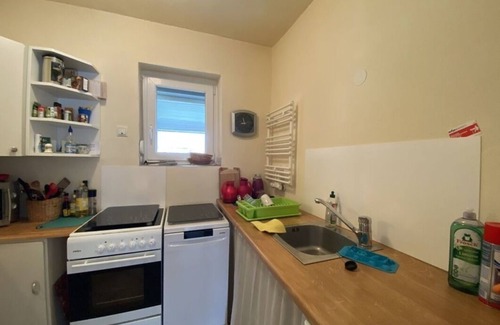 The kitchen is equipped with an oven, a stovetop, and a refrigerator, as well as a coffee maker and a microwave. Other amenities include a fireplace and heating.