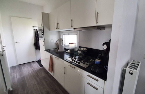 The kitchen is equipped with a stovetop, a refrigerator, and a dishwasher, as well as a coffee maker, an electric kettle, and a microwave. Other amenities at this 2-bedroom, 1-bathroom rental include a living room, heating, and a dining table.