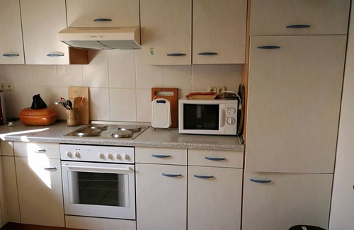 The kitchen is equipped with an oven, a stovetop, and a refrigerator, as well as a coffee maker, an electric kettle, and a microwave. And you can even travel light because you'll have access to laundry facilities.