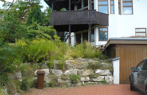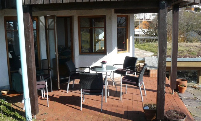 Ein naturnah gebautes Haus von 1995, in Holzständerbauweise mit massiven Lehmwänden und Elektrosmogabschirmung garantiert ein wohngesundes Klima wie sonst kein Haus es kann. Eine moderne Fußleistenheizung und die ausschließliche Verwendung von Naturölen für die Vollholzmaterialien sorgen für schadstofffreie Luft. So läßt es sich leben, so läßt sich gesund Urlaub machen !! Die Wohnung im Erdgeschoss mit großer überdachter Südwestterasse ist hell und sehr geräumig. Sie ist voll ausgestattet, Bettzeug und Handtücher liegen bereit, eine moderne Küche mit kleinem Herd und einem kleinen Grillofen machen Spaß beim Zubereiten Ihrer Speisen. Hochwertige Antiquitäten heben die Wohnatmosphäre und moderne bequeme Sitzmöbel und Betten lassen einen die Zeit entspannt genießen. Auf der Terrasse an lauen Sommerabenden den Sonnenuntergang über dem See genießen, was kann es Schöneres geben? Das Haus liegt am Ortsrand, nur 100 Meter vom Waldrand entfernt, wo die beschilderten Wanderwege zum Spazieren und für Radtouren einladen. Die Südhanglage fängt die Sonne ein und lässt sein warmes Mikroklima entstehen, der See mit Badestelle und Restaurant ist 1 km entfernt, Sie können zu Fuß, mit dem Rad oder auch mit dem Auto hinkommen, der Zug lädt zu Touren nach Konstanz und Radolfzell ein. Den Wanderweg am Waldrand entlang sind es nur ca. 800m bis zu den Schmieder-Kliniken. Lassen Sie den Blick, auch von der überdachten Terrasse, über die Felder des Klosters Hegne schweifen, rüber zur Reichenau, über den Untersee bis in die Schweiz, in absolut ruhiger Lage. Genießen Sie das wohngesunde Naturhaus, herzlich Willkommen !