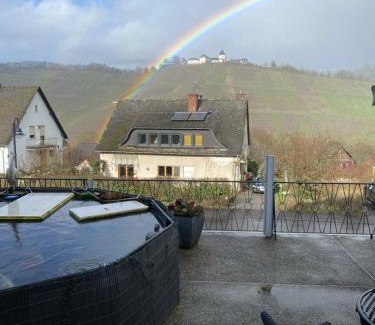 A recently renovated apartment, Ferienwohnung Rockenbach offers accommodations in Pünderich. This property offers access to a balcony, free private parking, and free Wifi. On clear days, guests can head outside to enjoy the apartment's outdoor fireplace or simply kick back and relax. Featuring a terrace and mountain views, the spacious apartment includes 3 bedrooms, a living room, satellite flat-screen TV, an equipped kitchen, and 3 bathrooms with a shower. Towels and bed linen are available in the apartment. Additional in-room amenities include wine or champagne. A bicycle rental service is available at the apartment. Frankfurt-Hahn Airport is 13 miles from the property.