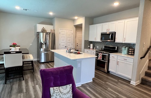 This colorful home has a style all its own. Located in Southeast Austin in Easton Park, a vibrant community with peaceful running trails.