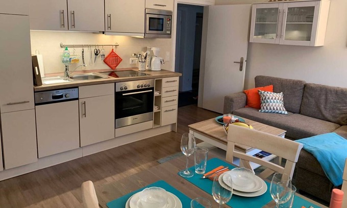The apartment on the ground floor has 53 sqm and was completely modernized in 2018 and refurnished. It has 3 rooms and a bathroom with shower / WC. Two separate bedrooms, one with a double bed and one with two single beds. The living room has a sitting area with sofa, a spacious dining area and the fully equipped kitchenette with ceramic hob, oven, microwave, fridge and freezer and dishwasher. Smart TV and radio in the kitchen and another TV in a bedroom. A travel cot and a high chair is available. Washing machine and drying room usable in the cellar. The whole apartment has a vinyl floor. Free WIFI. Lateral lake view from one of the bedrooms. Bed linen and towels are included and will be changed for longer stays.