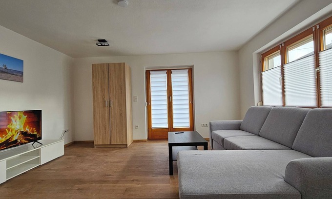 The living room is bright and equipped with a smart TV for a cozy evening in front of the TV. In addition, the large sofa is extendable and can therefore be used as a double bed.