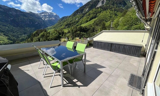 The outdoor area boasts a sunny terrace equipped with barbecue facilities, table, chairs and loungers for moments of relaxation. The quiet location guarantees an undisturbed, unobstructed view of the Tamina Valley and the Calanda, ideal for unwinding and recharging your batteries.