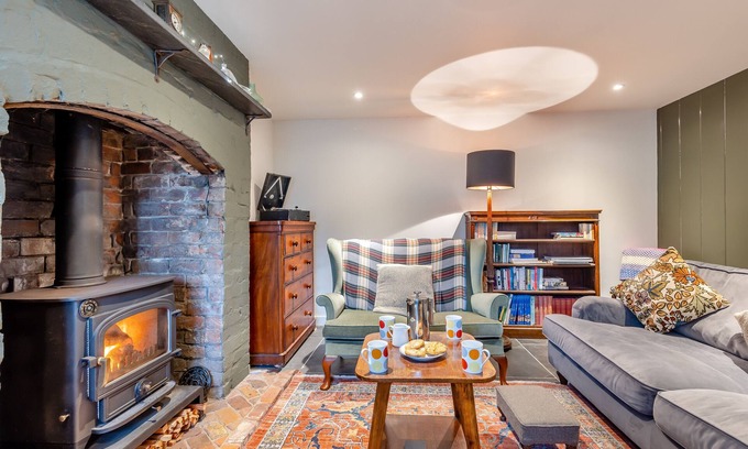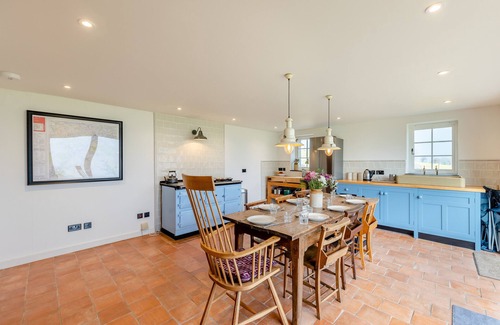A steep farm track and ford lead to your holiday hideaway with enchanting far-reaching countryside views from every room. Leave footwear in the boot room and from the hallway, step into the farmhouse-style kitchen/diner. Flooded with light from bi-fold glass doors opening onto the garden, this is a lovely space with an Aga and a large dining table for shared meals. The interior is charmingly furnished throughout, with items of vintage furniture beneath original beams, books and lamps all enhancing the welcoming atmosphere. Light the wood burner in the cosy lounge and watch the Smart TV from comfortable seating. A shower room completes the ground floor, while upstairs you’ll find a family bathroom and four delightful bedrooms with lovely views. These comprise a king-size with an en-suite shower room, a second king-size, a twin room and a children’s bunk room (with restricted head room on the top bunk).