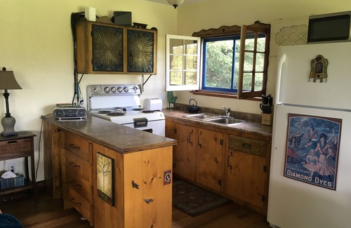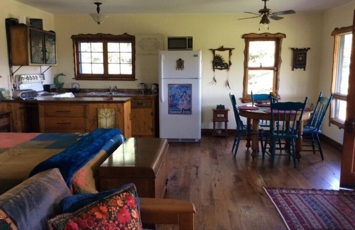 Complete with excellent wifi this unique cabin remains open year round and offers a most tasteful interior ambiance. Cream colour Adobe walls are accented by rich hardwood floors, antique furnishings and a combination of internationally collected and hand hewn artworks. It is meticulously clean and well stocked with fresh towels and silky bamboo sheets.