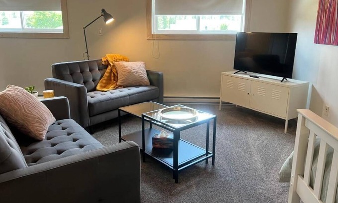 The living room is furnished with two comfortable couches and a smart TV, allowing you to easily access your preferred streaming services or peruse local cable channels. The bathroom includes a stand-up shower and is well-stocked with body wash, shampoo, conditioner, a hair dryer, and plenty of extra towels. For added convenience, there's a combination washer/dryer unit within the suite.