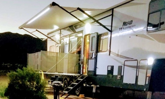This is not at a campsite, you will pick a local campsite and book it assuring you have enough foom for a 44 ft camper, and we will deliver, or u can pick up and tow.(a local favorite is lake pleasant rv park and phoenix international raceway)Take camping to the next level, why have a hurt back after sleeping on a leaky air mattress when you can sleep in a 44 ft RV with 3 queen beds, plus a loft. Kitchen with 3 burner stove, microwave, oven, full size rv fridge with freezer. Full bathroom with shower. Garage space is 12.5 ft and will fit a utv, four wheelers, or dirt bikes. Does have u bolts to tie down your toys. 2 fold out patios, 4 tvs, indoor/outdoor radio. Outdoor night life in the RV is where it is at!!
