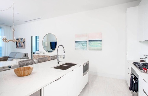 The open concept kitchen/living area reflects the beautiful tropical island, beach vibe. It has a large TV with reclaimed wood look. On the adjacent, private balcony, there is a cute teak wood high table and chairs, perfect for enjoying happy hour cocktails, or a cup of coffee as the sun rises and sets. The large comfy, yet modern sofa is perfect for hosting.