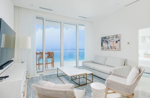The master bedroom, just off the living area, has a large TV, king-sized bed with crisp, white bedding, floor-to-ceiling drapery with black-out curtains, and full access to a private balcony with expansive views.There are two walk-in closets.