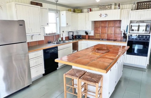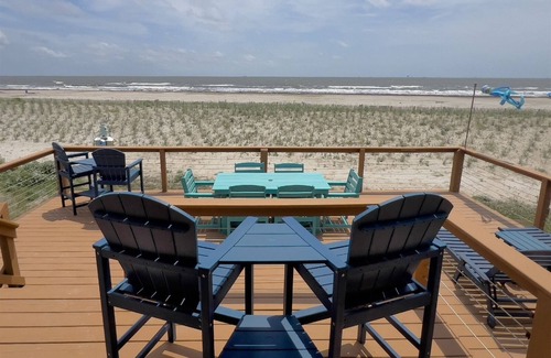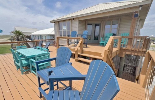 Fin and Bridge is a 2-bedroom beachfront house with two full bathrooms. Each bedroom has a new king-size bed and the 2nd bedroom also contains bunk beds. This place is set up with a wonderful, partially covered back deck facing the beach, featuring lots of new deck furniture to enjoy the sunrise and breezes from the Gulf of Mexico. The downstairs area features an enclosed outdoor shower, along with more furniture to gather with family and BBQ or boil up some fresh-caught seafood. A pet-friendly option is available for an extra charge. The nearest golf cart crossover path is at 4.5 Olive Lane, just one street over. Beach toys, games, puzzles, crab pots, and a deep freeze are also available to guests.