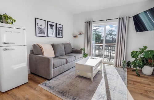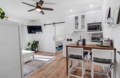 After enjoying a great time exploring the Oceanside Downtown Area, you can enter your private suite through a well-lit side gate, illuminated by bright lights and monitored 24/7 for your added security. This entry is shared with the guests of 2 more units. Coffee and little breakfast nibbles are available to get your day started right. Coffee is also available in your kitchenette. With a walkable score of 92, enjoy the fresh air and the beauty of Oceanside with a 5-minute walk to downtown and a 10-minute walk to the Oceanside Pier. Cars give pedestrians the right of way! Enjoy the use of our custom Surfboard Shower with hot and cold water. The 2nd bed is a high-quality Living Spaces Aramis 83" sofa with a queen-sized bed. The property has smoke detectors connected to a sprinkler system!
