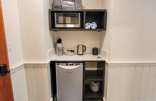Welcome to the Fir King Room at The Inn At Mazama, offering comfort and convenience in the heart of Mazama. This spacious room features a king-sized bed, a cozy seating area, and a small kitchenette with fridge, microwave, and coffee maker. Refresh in the private bathroom with a rejuvenating shower.