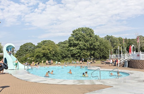 Recreational amenities at the campground include a waterslide and a seasonal outdoor pool.