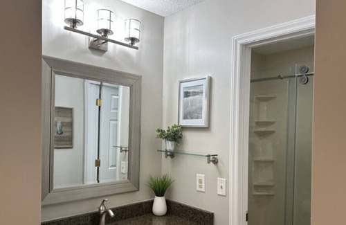 This condo has two comfy king beds in ensuite bedrooms. One bedroom has a walk in shower while the other has a shower/tub combo. The bedrooms are on each side of the condo with a living space and kitchen in between. The kitchen is fully stocked for you to be able to cook if you desire.