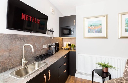 You will be staying in a compact, stylish studio with a king size bed (bed can be split into two small singles if requested) with hotel style linens and towels. You have an en-suite shower room with a large walk-in shower. The compact kitchenette has a single pan hob, microwave, mini fridge, kettle and toaster. It is well stocked with plenty of crockery and cooking utensils. If you require a full kitchen, please book one of our other units in the building. There is a dining table for two and a separate desk if WFH. Fast speed WiFi is free and reliable.