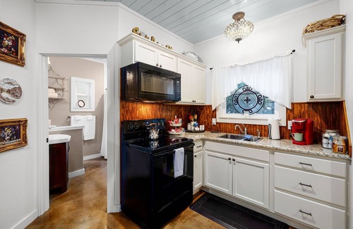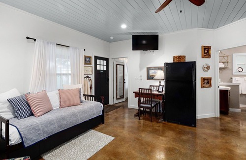 Nestled under a canopy of oak trees, and located within walking distance of historic Gruene, Texas, our guest house is a two-story "home away from home" for guests desiring a cozy, romantic retreat, a gathering place for family, a refreshing spiritual retreat, or a secluded spot for quiet work. In the style of an historic, German Sunday House, your experience will be reminiscent of a stay on the ground floor of an old home with the conveniences of modern amenities and easy recreation. Please see Property #7406306 River Haven Guest House if you would like to book the full house.