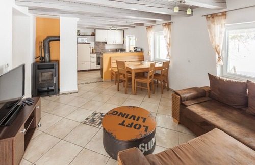 Das Ferienhaus ist 65qm groß und ca. 50 Meter vom Haupthaus entfernt, idyllisch am Fischweiher und Hirschgehege gelegen. Das Ferienhaus verfügt über zwei Schlafzimmer, eines mit Doppelbett und das zweite mit Etagenbett, Gitterbett und Zustellbett. Das Wohnzimmer ist mit einem Sofa und Esstisch, sowie Kaminofen und LED Flachbildschirm mit DVD-Player ausgestattet. In der offenen Küche befinden sich ein Cerankochfeld, Backofen, Mikrowelle, Kühlschrank und Geschirrspülmaschine. Das Badezimmer ist mit Dusche und WC augestattet. Kostenfreies W-Lan ist im Restaurant oder an der Rezeption empfangbar.