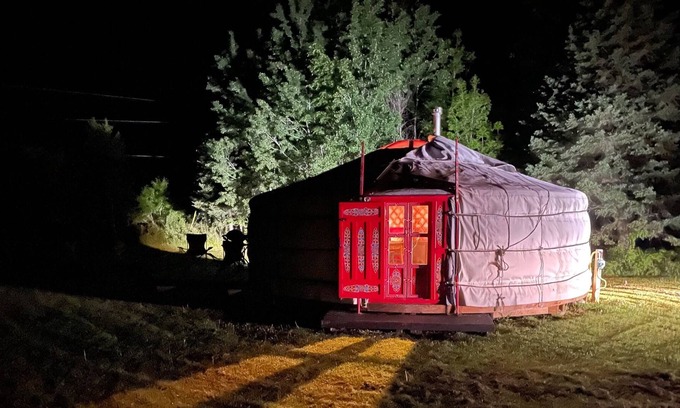 This traditional four season Mongolian Yurt features it’s own bathroom, kitchen, living area and queen size bed. It is heated with a thermostatically controlled fireplace.