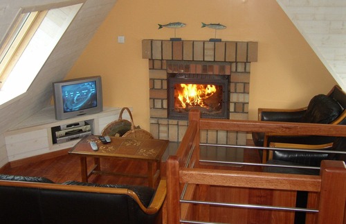 On the floor is the room of life with done up kitchen, corner meal and living room with chimney, TV, DVD, CD. This living room gives directly onto the terrace with a table and chairs, 2 wooden sunbeds with cushions, 1 beach cabin for storage, the other with freezer. Barbecue