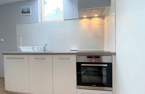 1 equipped kitchen overlooking the terrace, with 3-burner induction hob, electric oven, dishwasher, microwave, fridge freezer -