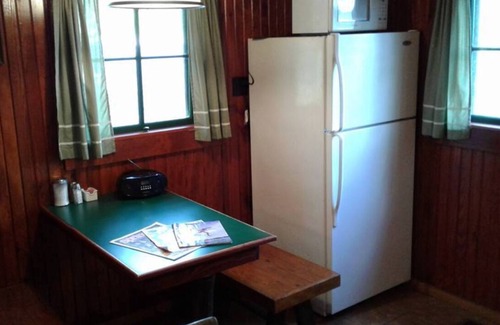 Small one-bedroom cabin with similar floor plans to Cabins 3 & 4. - Completed in July, 2009, this cabin was styled after our original Cabins 3 & 4. It has a similar floor plan, and the same rustic appearance, as those original small one-bedroom cabins, and many of the same features and amenities. However, it has a more spacious feel, with a high vaulted ceiling throughout, ceiling fans in the living room and bedroom, and a balcony deck off the bedroom. It has central heat and air conditioning for year round comfort. Sleeping accommodations include a queen size bed in the bedroom and a futon couch in the living room that folds down into a comfortable double bed. The bathroom includes a standard-sized tub with Jacuzzi jets and shower. As with all our cabins, this one has a complete kitchen, including stove, refrigerator, microwave oven, and automatic coffeemaker. There's a TV and DVD player, as well as an AM/FM stereo radio with CD player.