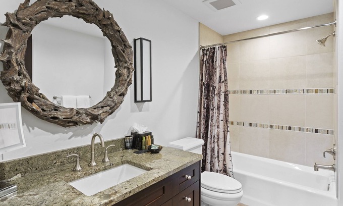 shower and single sink. The third bedroom has a king bed. The bathroom has a