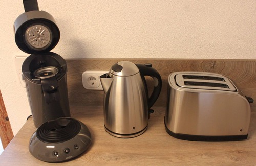 The bedroom is furnished with a double bed (180 cm, 2 separate mattresses, adjustable slatted frames) and a wardrobe. The living and dining area is equipped with a smart TV and a comfortable sofa bed. The open, fully equipped kitchen (including dishwasher, Senseo pad coffee machine, toaster, kettle) is located in the entrance area of the holiday flat. The bathroom with walk-in shower, washing machine, hairdryer and towels can be reached via the open living area.
