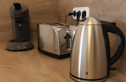 The bedroom is furnished with a double bed (180 cm, 2 separate mattresses, adjustable slatted frames) and a wardrobe. The bathroom is equipped with a walk-in shower, washing machine and hairdryer and can be reached via the bedroom. The open-plan kitchen/living room with dining area is the centre of the flat with a smart TV, a comfortable sofa bed and a fully equipped kitchen (including dishwasher, Senseo pad coffee machine, toaster, kettle).