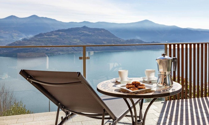 This is our only recommendation after seeing the breathtaking images of Corinto, a sensational lakefront three-room apartment on two levels. Spread over 90 square metres, it offers a large furnished garden on the ground floor and a stunning terrace with full-wall glazing on the first, extending the entire length of the flat and literally overlooking the natural amphitheatre that is Lake Iseo. And that's not all: as soon as you shift your gaze to the communal areas you discover that the panoramic swimming pool is an infinity pool and that there is also a fitness area in the complex, also with an unparalleled view. There, if you haven't made it yet, you can now get back to breathing normally.
