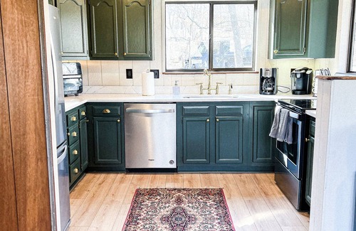 The chalet itself provides sleeping for 10 guests. 3 bedrooms, and 2 bathrooms, with the primary bedroom on the main level. First bedroom has 2 king beds, the second bedroom has 1 king bed and 2 twin beds, and the third bedroom has 1 queen bed. The chalet has a wood burning fireplace to keep you cozy in the cooler months. The kitchen is fully stocked and ready for your family recipes.