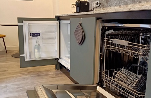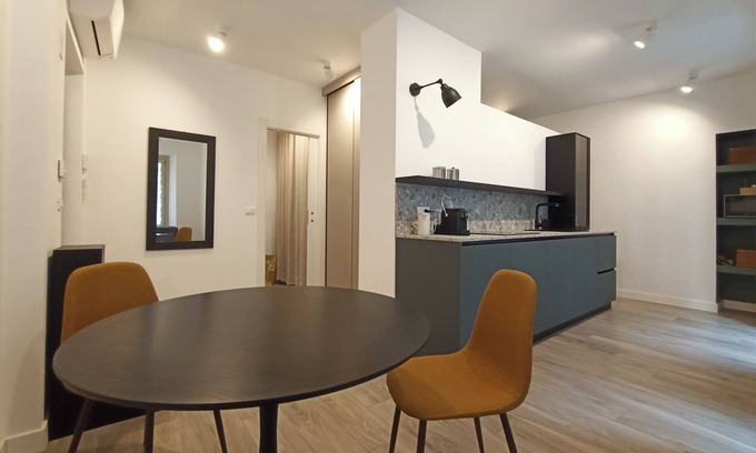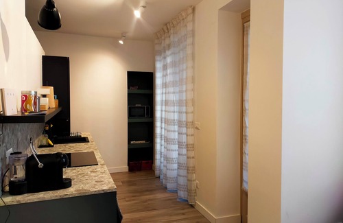 The 40 m2 apartment, equipped with all comforts and managed with care for the environment, consists of a living room with kitchen, a bedroom partially separated from the living room and a bathroom with a spacious shower and ante-bathroom. It has a lovely private courtyard with table and chairs, accessible both from the balcony and from the building's courtyard. It is located on the ground floor in the inner courtyard. The flat and the entire building were renovated in 2023. It is ideal for two people, but can accommodate a third person on the single sofa bed in the living room.