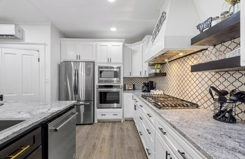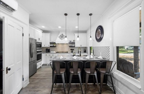 Discover a hidden gem nestled in nature. This home boasts a chef's kitchen with bar seating, top-tier appliances, and a spacious island. The cozy living room features a big TV, fast internet, a game console, and a collection of board games and books. The outdoor space is a serene oasis surrounded by trees, offering a fire pit with seating, outdoor dining, a BBQ grill, and convenient on-site parking. For families, we provide a Pack 'n Play, high chair, and an array of toys. Plus, a dedicated workspace ensures productivity.